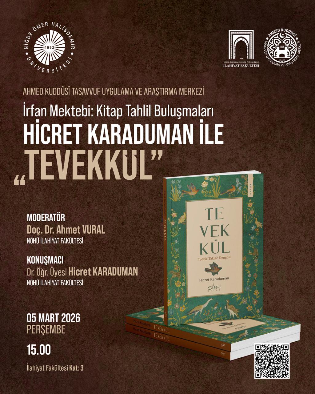 5 Mart 2026 tarihinde Dr. Öğr. Üyesi Hicret Karaduman’ın konuk olarak yer aldığı etkinlikte “Tevekkül” adlı eserin tahlili gerçekleştirildi.