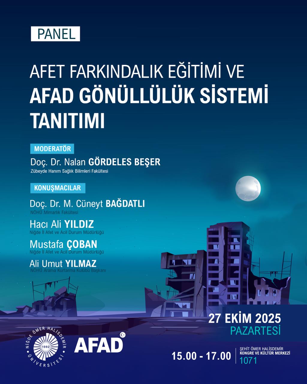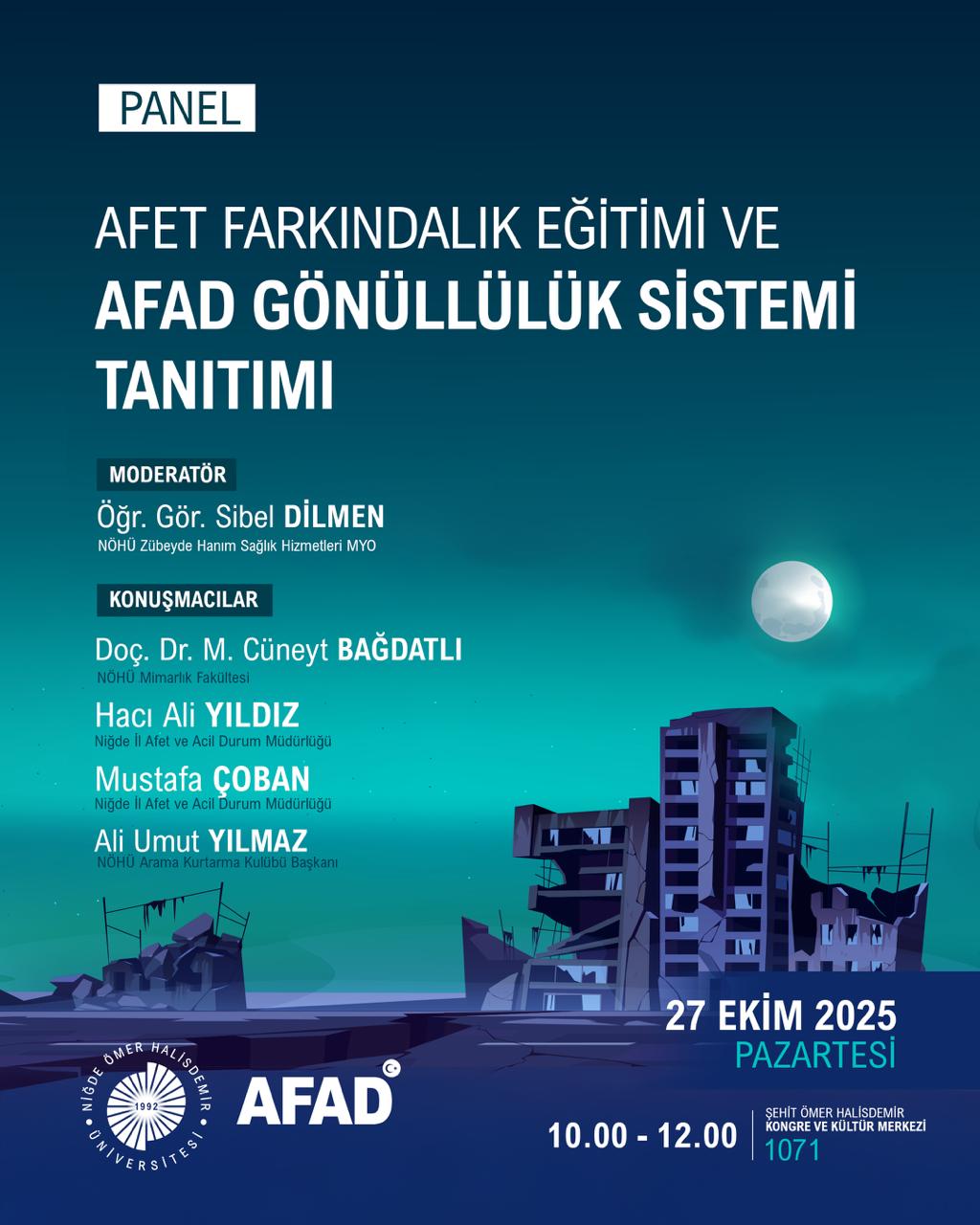Afet Farkındalık Eğitimi ve AFAD Gönüllülük Sistemi Tanıtımı Etkinlik Ayrıntıları Etkinlik Adı: Afet Farkındalık Eğitimi ve AFAD Gönüllülük Sistemi Tanıtımı Etkinlik Tarihi: 27.10.2025 - 27.10.2025 / 10:00 -12:00 Etkinlik Türü: Panel Etkinlik Yeri: Şehit Ömer Halisdemir Kongre ve Kültür Merkezi Salon 1071 Son Güncelleme Tarihi : 22.10.2025