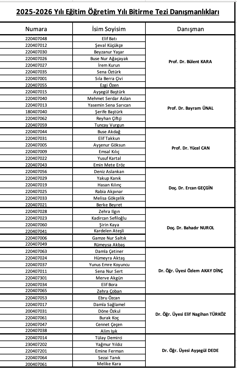 Bitirme Tezi Danışmanlıkları (2025-2026)