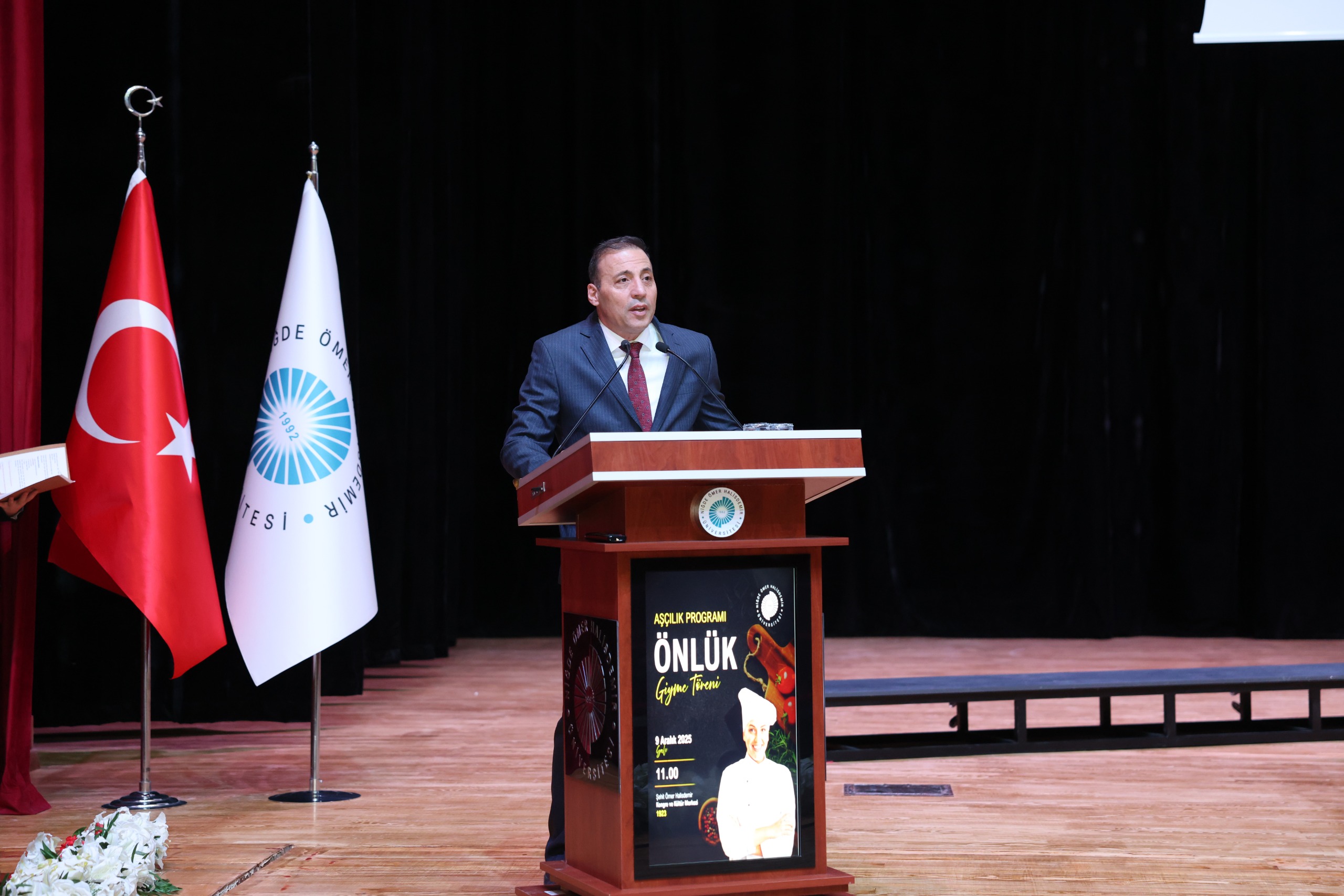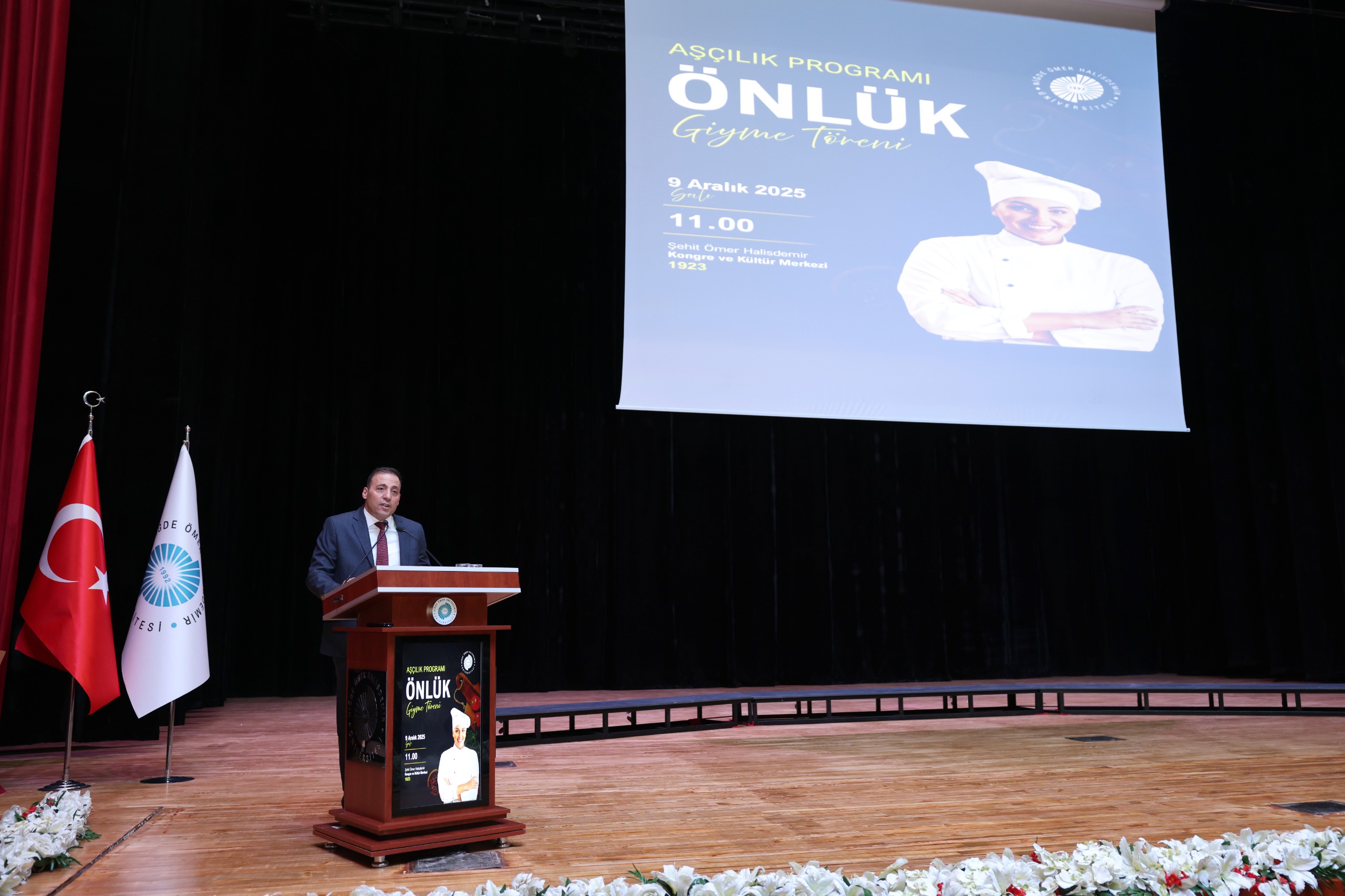 Üniversitemiz Rektörü Prof. Dr. Hasan Uslu törenin ardından yaptığı açıklamada mutfak kültürünün milletlerin kimliklerinde önemli bir yere sahip olduğunu, Türk ve özellikle Niğde mutfağının medeniyetimizin tarihsel zenginliğini yansıttığını belirtti. Aşçılık Programı’nın yedinci yılına girdiğini hatırlatan Rektör Uslu, programın hem sektöre nitelikli eleman yetiştirmeyi hem de yerel mutfak kültürünü yaşatmayı amaçladığını belirtti. Ahilik geleneğinin günümüzde önlük giyme törenleriyle yaşatıldığını da dile getiren Rektör Uslu, “Aşçılık Önlüğü Giyme Töreni’miz bu geleneğin bir parçası ve öğrencilerimiz bu anlayışla gelecekte gastronomi ve turizm sektöründe Üniversitemizi en iyi şekilde temsil edeceklerdir.” dedi. Rektör Uslu konuşmasına önlük giyen öğrencileri ve ailelerini tebrik ederek son verdi.