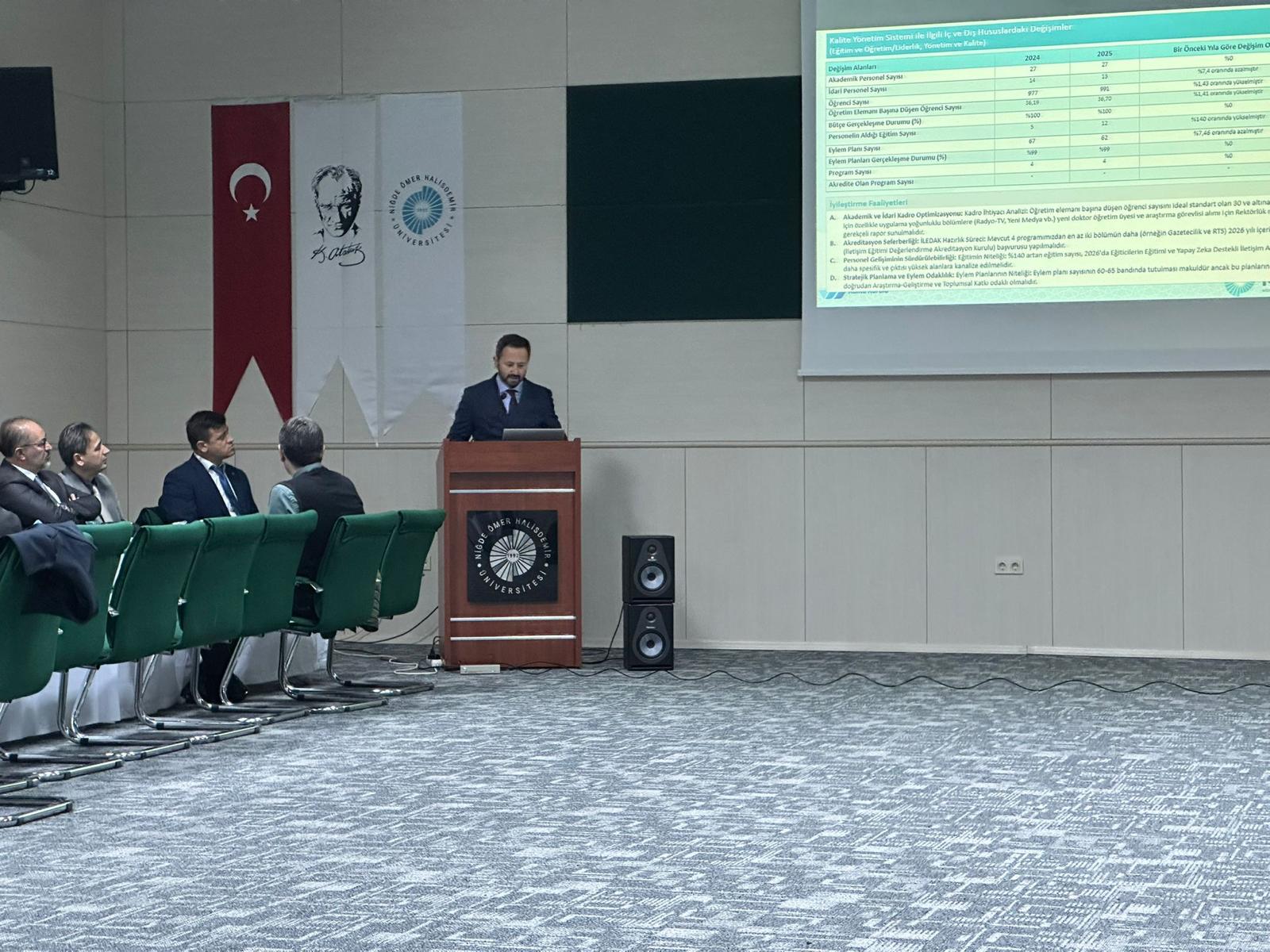 Toplantıda Fakültemiz adına sunulan değerlendirme raporunda, geçtiğimiz yıl içerisinde personel yetkinliklerinin artırılmasına yönelik eğitim faaliyetleri, bütçe disiplini ve eylem planlarının başarıyla uygulanması konularındaki veriler paylaşıldı. Özellikle araştırma-geliştirme süreçleri ve öğrenci projelerindeki artış grafiği dikkat çekerken, Fakültemizin üniversitemizin genel kalite vizyonuna sunduğu katkılar vurgulandı. 2025 yılı verilerinin detaylı analiziyle birlikte, eksik görülen alanlarda yapılacak iyileştirme faaliyetleri üzerinde duruldu.