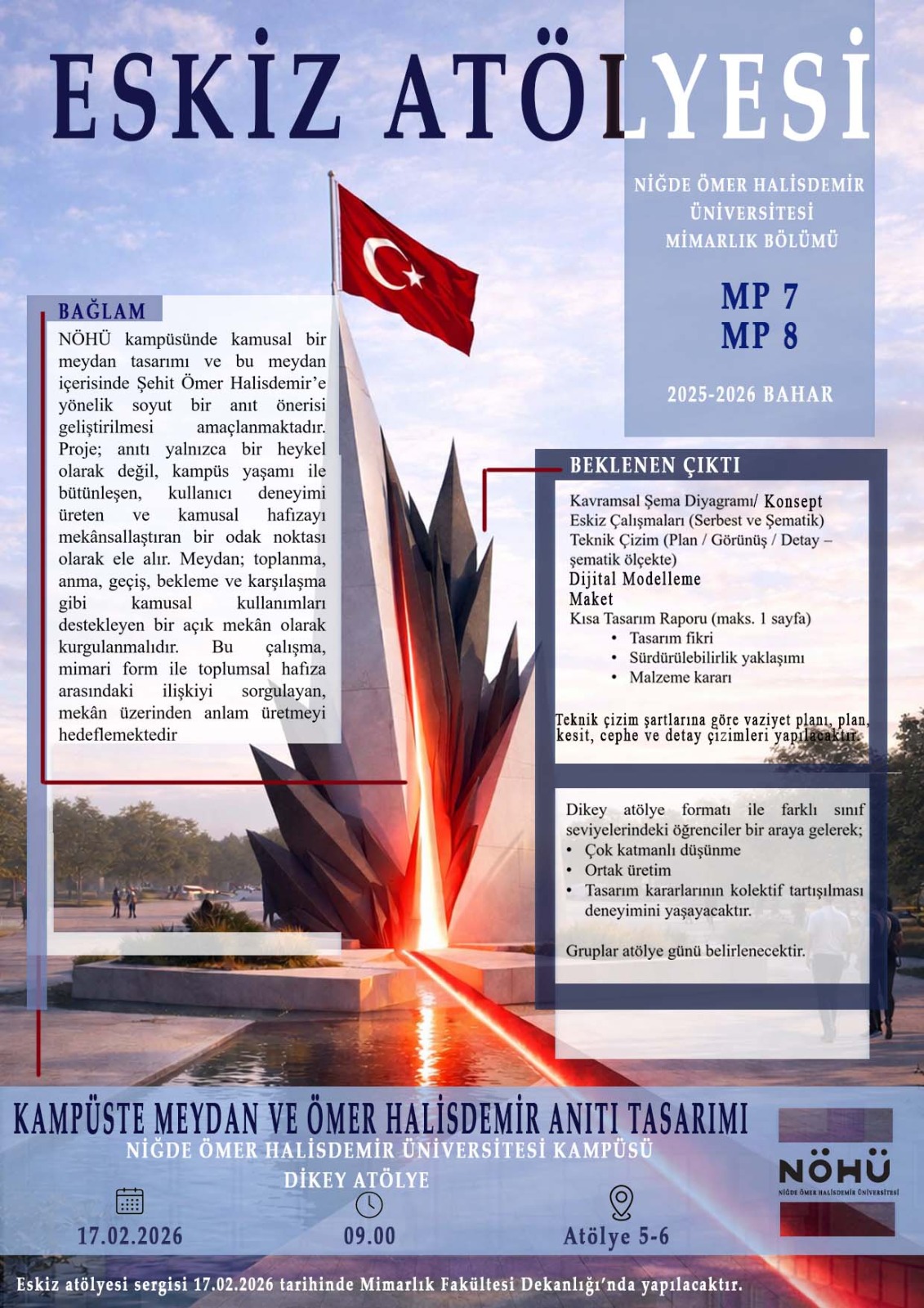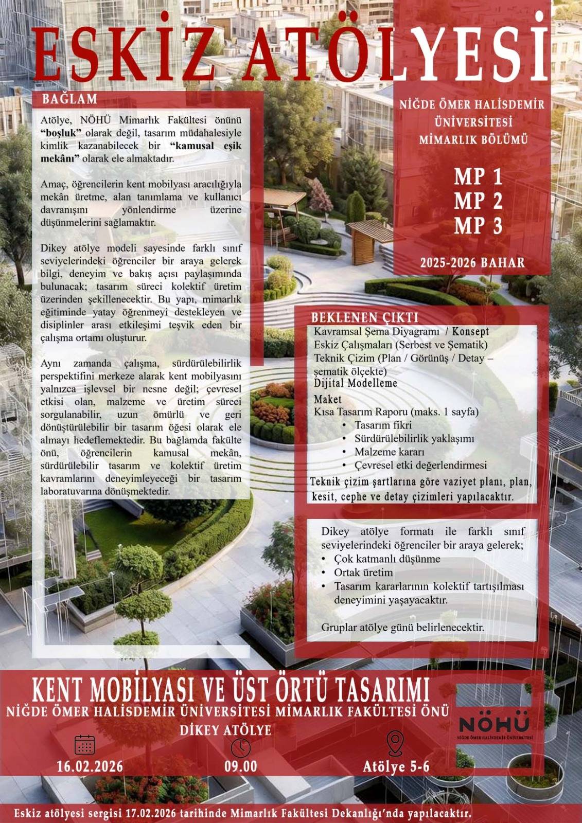 Mimari Proje dersleri kapsamında 2025-2026 Bahar Dönemi ilk haftasında eskiz sınavları gerçekleştirilecektir. Sınav dikey atölye mantığıyla gerçekleştirilecektir. Bu kapsamda 16.02.2026 tarihinde Mimari Proje I-II-III dersleri, 17.02.2026 tarihinde Mimari Proje IV-V-VI-VII-VIII derslerinin eskiz sınavları gerçekleştirilecektir. Her grup kendi içerisinde değerlendirilerek ödüller verilecektir ve tüm çalışmalar için 17.02.2026 tarihinde Mimarlık Fakültesi Dekanlık Binasında sergi düzenlenecektir.