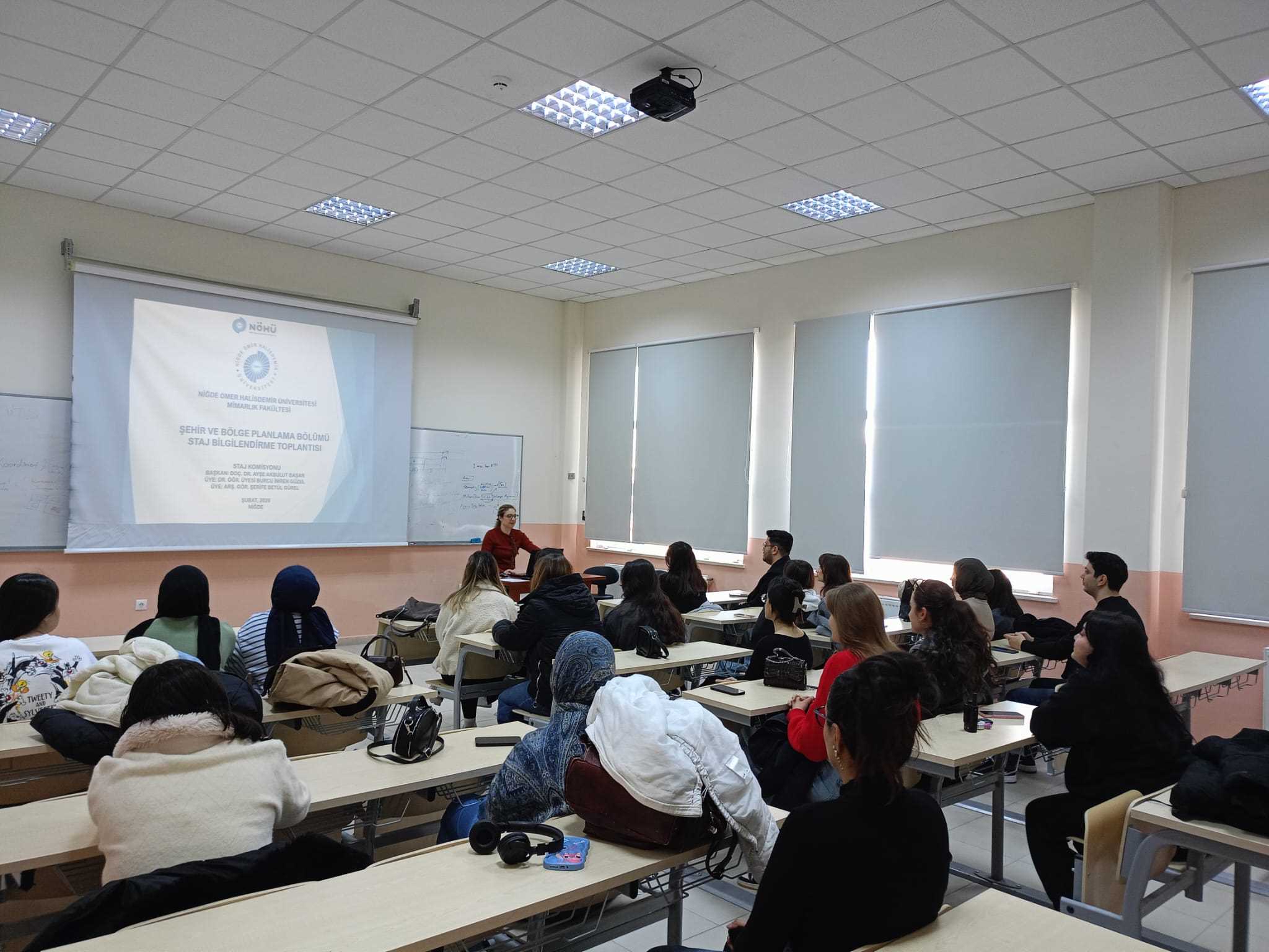 Toplantıda, NÖHÜ Şehir ve Bölge Planlama Bölümü stajlarına dair genel bilgiler, stajlarda yapılması gerekenler, etik kurallar ve sorumluluklar, iş sağlığı ve güvenliği, staj süresince dikkat edilmesi gereken hususlar, staj sonu teslim edilecekler ve staj sonrası değerlendirme süreci hakkında bilgiler paylaşıldı. Ayrıca, öğrencilerden gelen sorular yanıtlanarak staj süreciyle ilgili merak edilen konular açıklığa kavuşturuldu.
