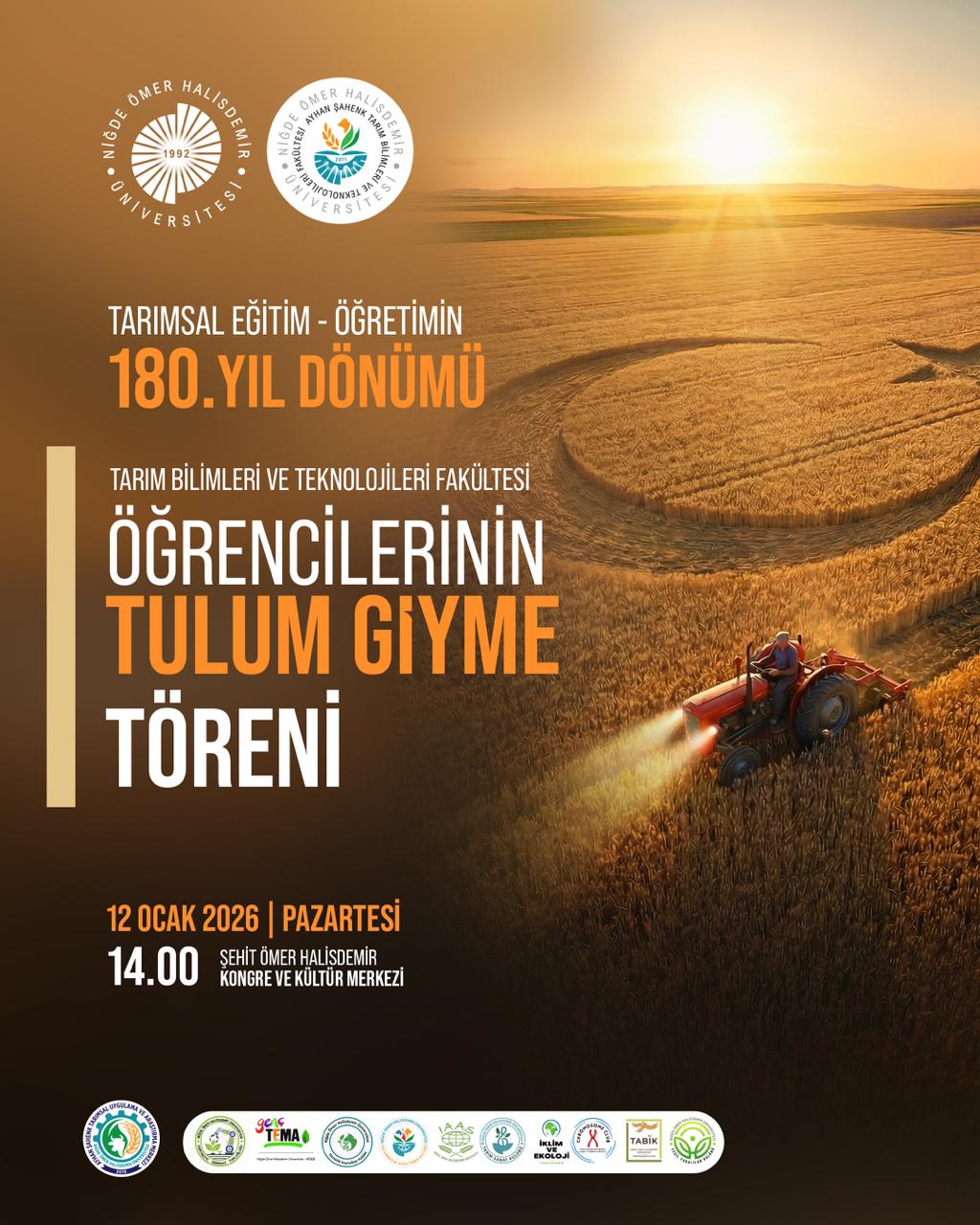 Üniversitemiz ev sahipliğinde fakültemiz ve tarımla ilgili öğrenci kulüpleri tarafından, ülkemizde 10 Ocak 1846'da ilk ziraat mektebinin açılmasıyla başlayan 'Tarımsal Eğitim ve Öğretimin 180. Yıl Dönümünü' kutlamak amacıyla program düzenlenecektir.