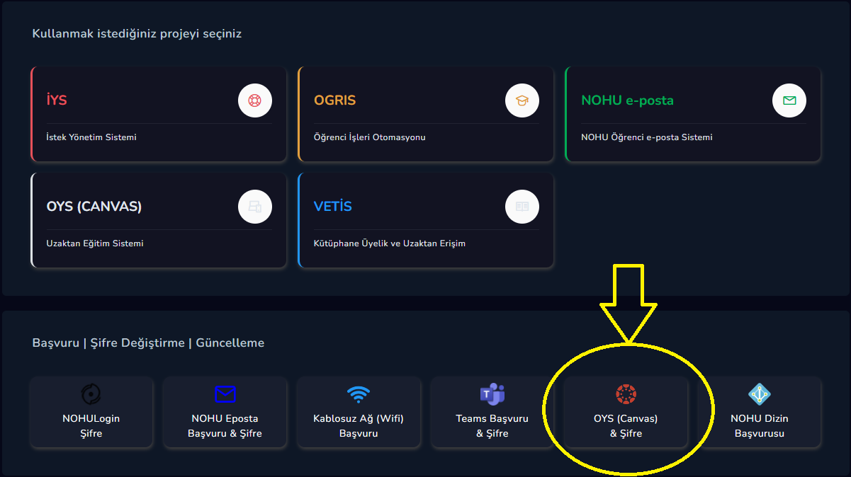 NOHU Login'e giriş yaptıktan sonra aşağıda gösterildiği gibi "OYS (Canvas) & Şifre" butonuna tıkladığınızda çıkan şifre belirleme penceresinden şifrenizi yazıp şifrenizi belirleyebilir, aynı ekrandan unuttuğunuz şifrenizi değiştirebilirsiniz.