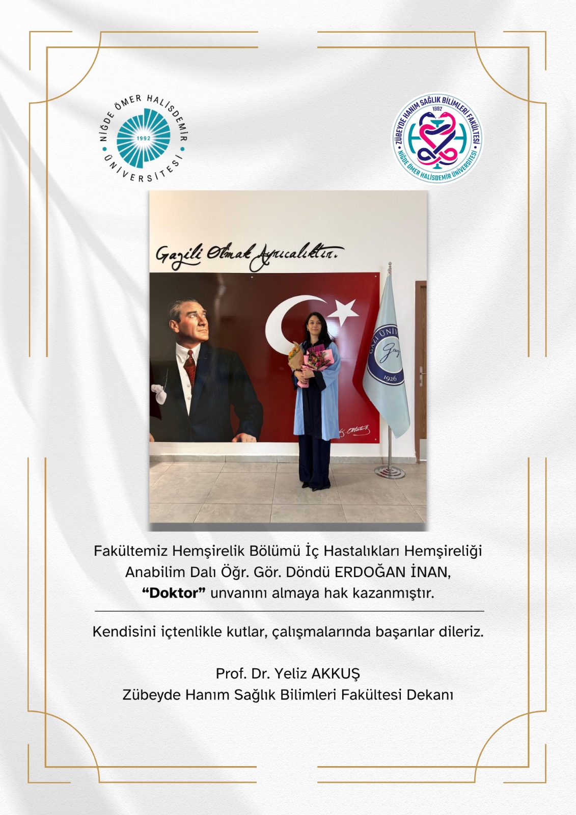 Tebrik 30.07.2026 24.04.2026 Fakültemiz Hemşirelik Bölümü İç Hastalıkları Hemşireliği Analim Dalı Öğr. Gör. Döndü ERDOĞAN İNAN “Doktor” unvanını almaya hak kazanmıştır. Kendisini içtenlikle kutlar, çalışmalarında başarılar dileriz. Son Güncelleme Tarihi : 24.04.2026