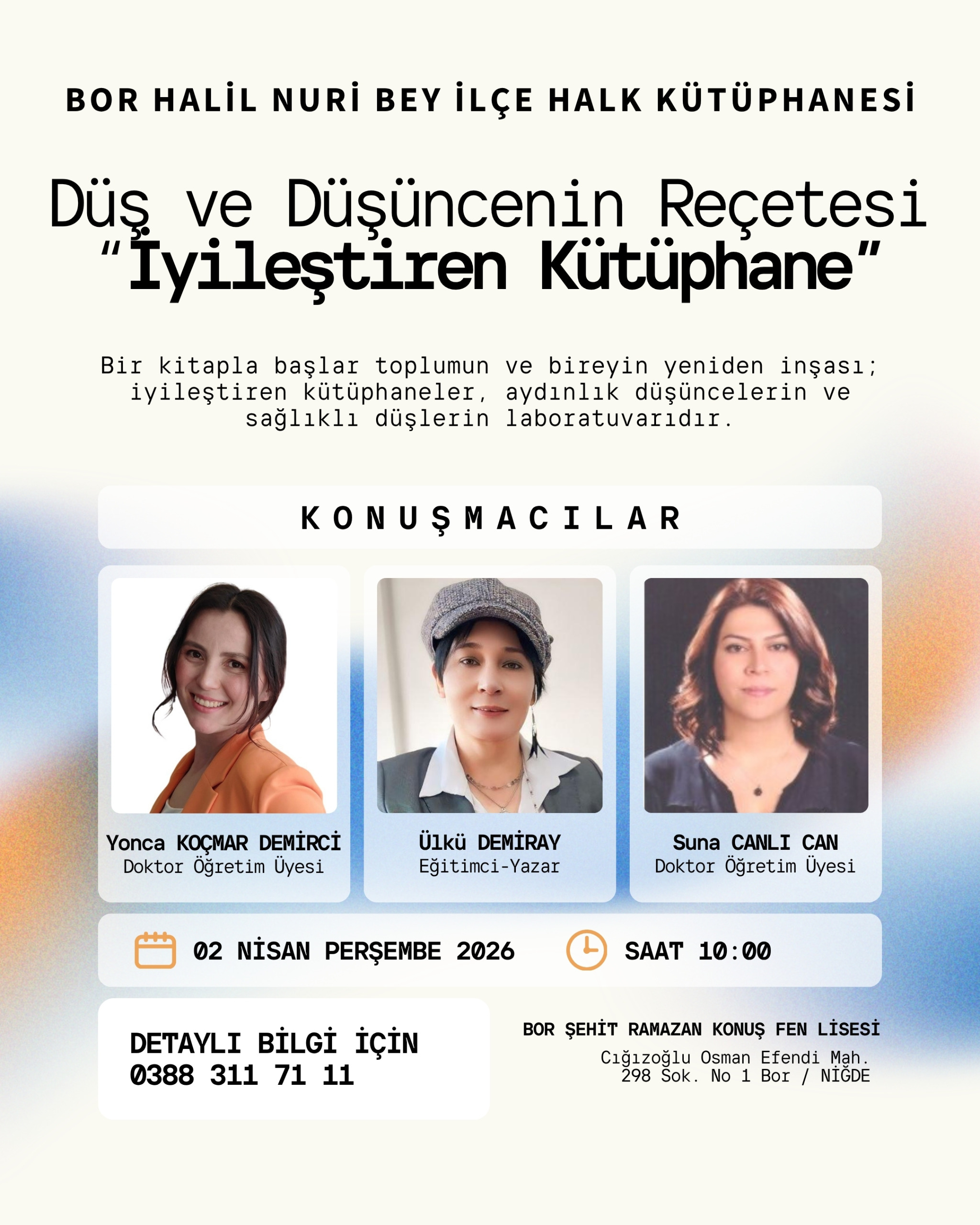 Bor Şehit Ramazan Konuş Fen Lisesinde düzenlenen “Düş ve Düşüncenin Reçetesi: İyileştiren Kütüphane” başlıklı panelde, Eğitim Fakültesi Türkçe Eğitimi Anabilim Dalı öğretim üyeleri Dr. Öğr. Üyesi Suna Canlı Can, Dr. Öğr. Üyesi Yonca Koçmar Demirci ve eğitimci-yazar Ülkü Demiray konuşmacı olarak yer aldı.