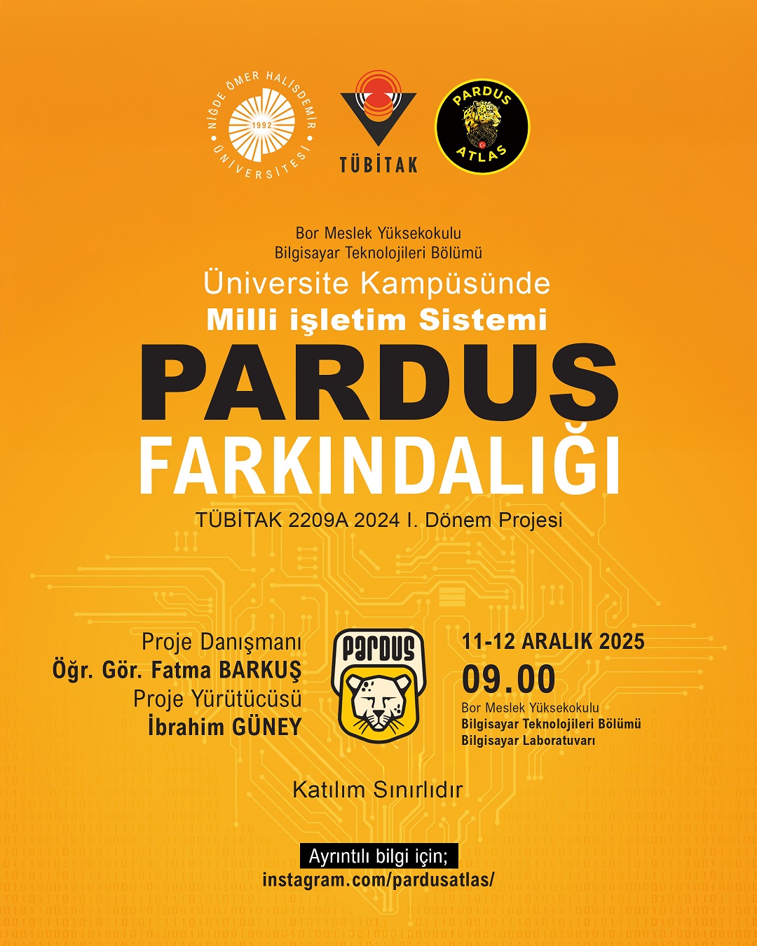 Bölümümüz Bilgisayar Programcılığı Programı, 11–12 Aralık 2025 tarihlerinde Yerli Malı Haftası kapsamında teknoloji ile kültürü bir araya getiren anlamlı bir etkinliğe ev sahipliği yaptı. TÜBİTAK 2209-A kapsamında desteklenen “Üniversite Kampüsünde Millî İşletim Sistemi PARDUS Farkındalığı” adlı proje; akran eğitimi uygulamaları, TÜBİTAK ULAKBİM yetkilisinin çevrim içi katılımı ve teknik gezi etkinlikleriyle gerçekleştirildi.