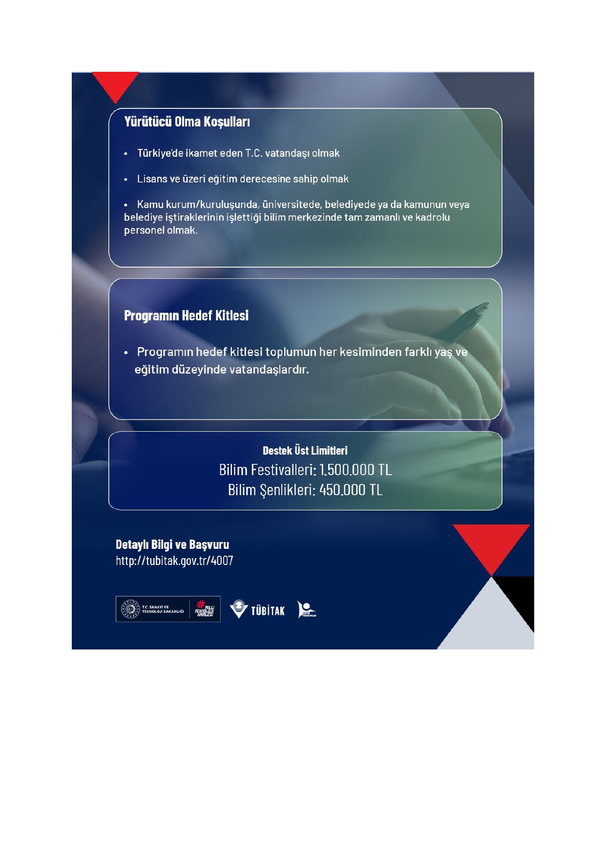 Bilim ve Toplum Başkanlığı 4007 Destek Programı Başvuruları Hk. 05.02.2026 Başvuru ve detaylı bilgi için Tıklayınız. Son Güncelleme Tarihi : 05.02.2026