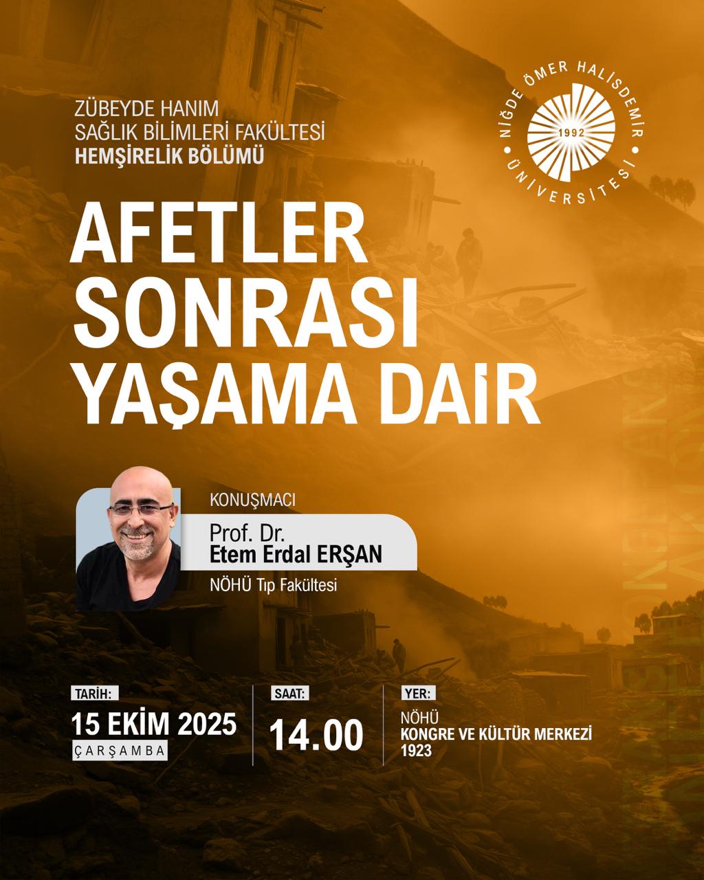 Afetler Sonrası Yaşama Dair Etkinlik Ayrıntıları Etkinlik Adı: Afetler Sonrası Yaşama Dair Etkinlik Tarihi: 15.10.2025 - 15.10.2025 / 14:00 Etkinlik Türü: Konferans Etkinlik Yeri: Şehit Ömer Halisdemir Kongre ve Kültür Merkezi Salon 1923 Son Güncelleme Tarihi : 14.10.2025