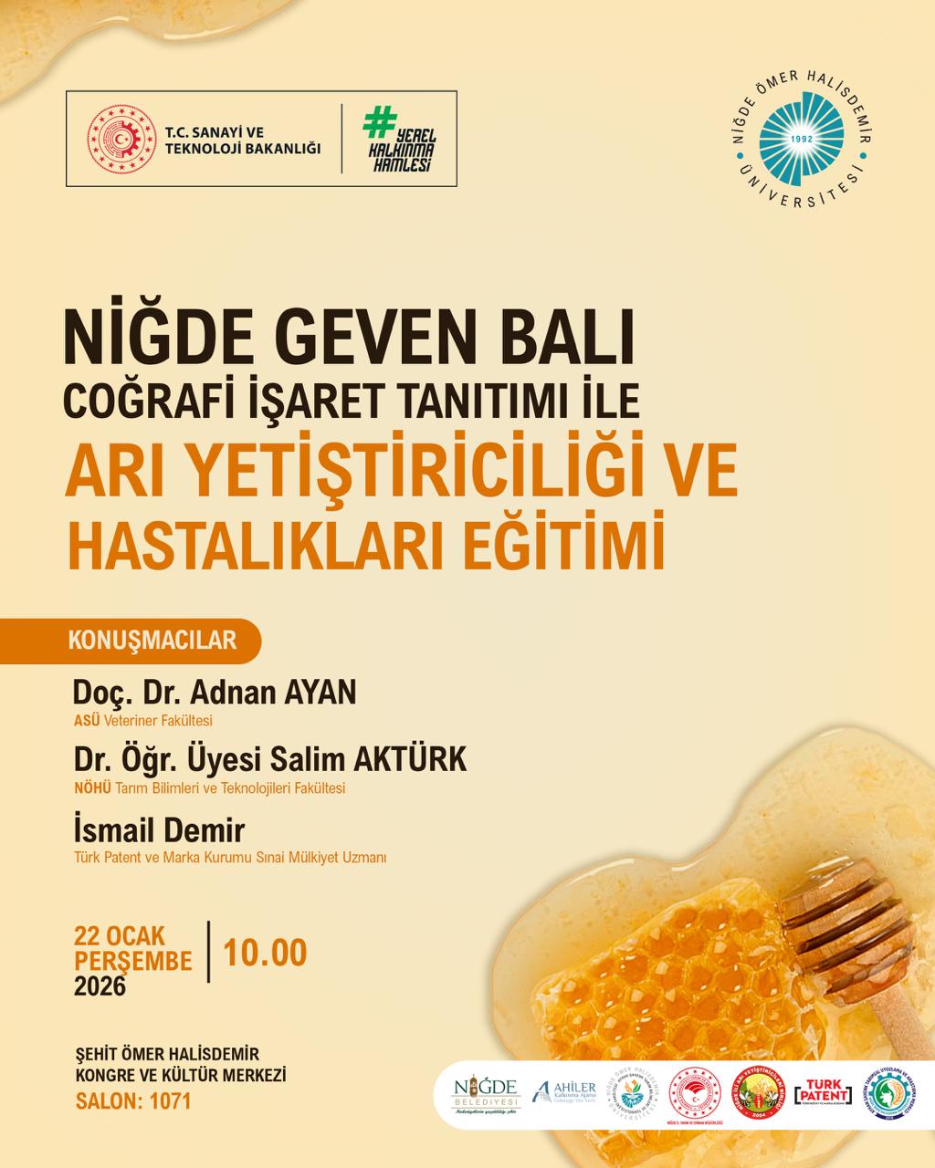 Arı Yetiştiriciliği ve Hastalıkları Eğiğtimi Etkinlik Ayrıntıları Etkinlik Adı: Arı Yetiştiriciliği ve Hastalıkları Eğiğtimi Etkinlik Tarihi: 22.01.2026 - 22.01.2026 / 10:00 Etkinlik Türü: Konferans Etkinlik Yeri: Şehit Ömer Halisdemir Kongre ve Kültür Merkezi Salon 1071 Son Güncelleme Tarihi : 20.01.2026