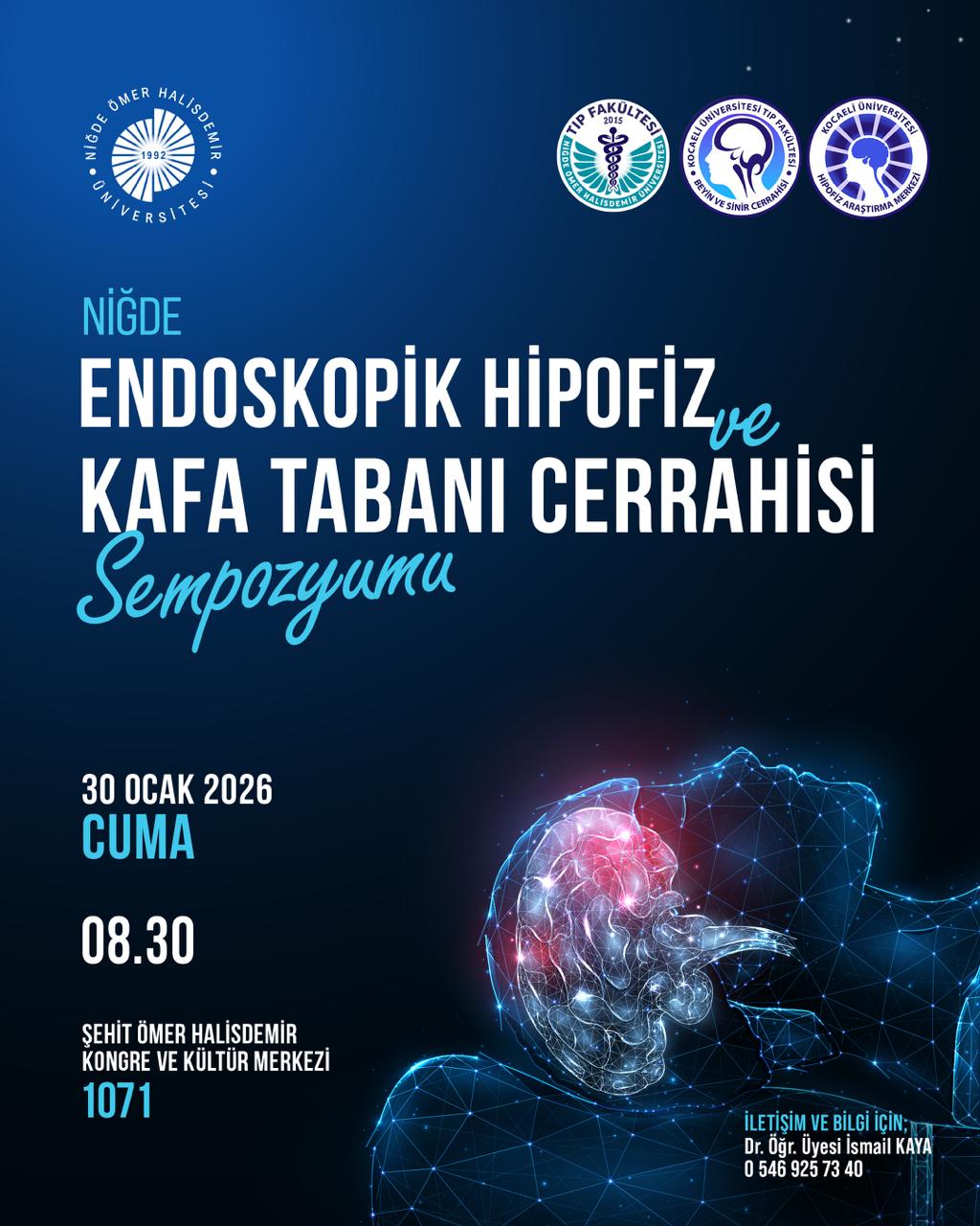 Endoskopik Hipofiz ve Kafa Tabanı Cerrahisi Sempozyumu Etkinlik Ayrıntıları Etkinlik Adı: Endoskopik Hipofiz ve Kafa Tabanı Cerrahisi Sempozyumu Etkinlik Tarihi: 30.01.2026 - 30.01.2026 / 08:30 Etkinlik Türü: Sempozyum Etkinlik Yeri: Şehit Ömer Halisdemir Kongre ve Kültür Merkezi Salon 1071 Son Güncelleme Tarihi : 21.01.2026