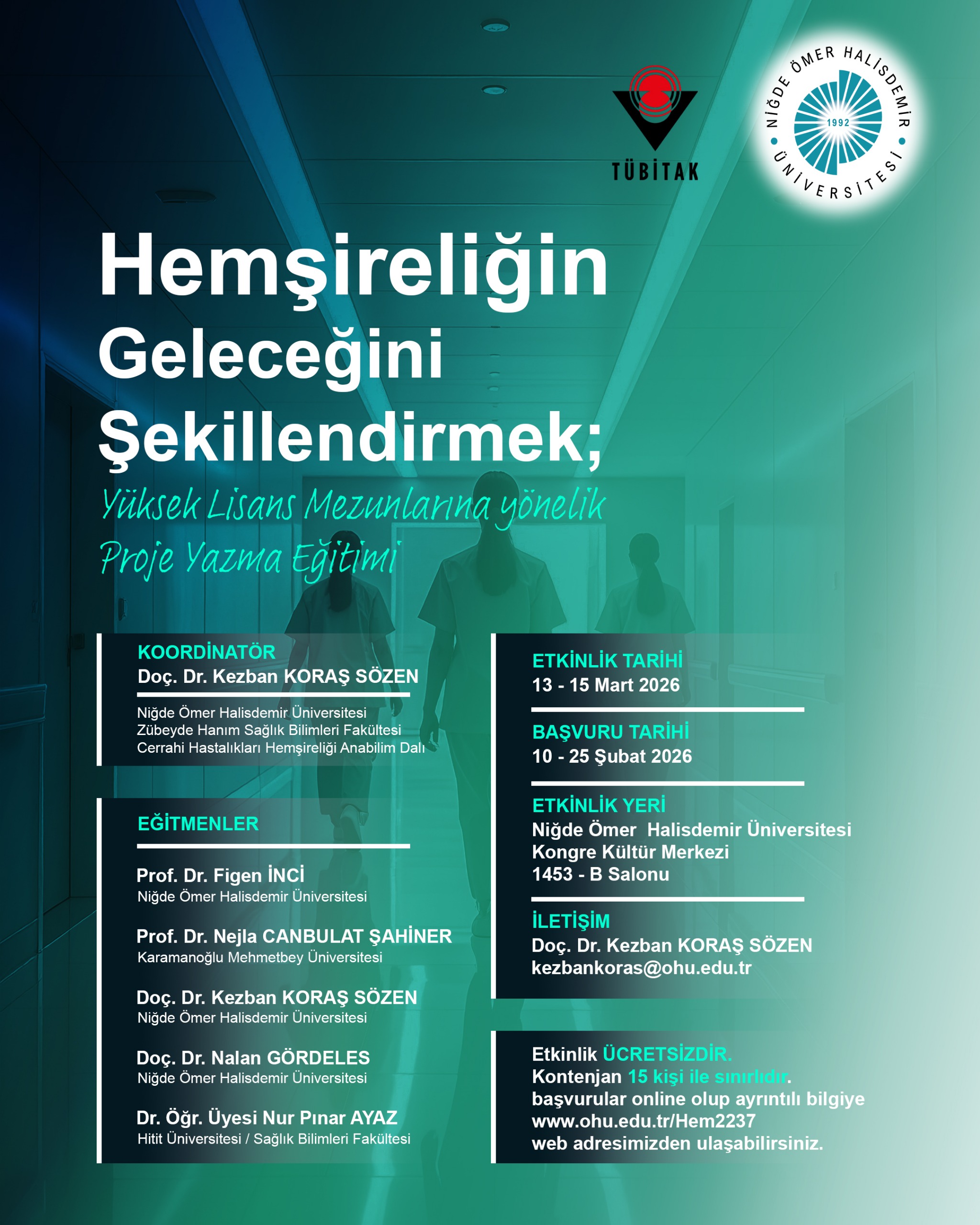 Hemşirelerin Geleceğini Şekillendirmek Yüksek Lisans Mezunları Yönelik Proje Yazma Eğitimi Etkinlik Ayrıntıları Etkinlik Adı: Hemşirelerin Geleceğini Şekillendirmek Yüksek Lisans Mezunları Yönelik Proje Yazma Eğitimi Etkinlik Tarihi: 16.02.2026 - 25.02.2026 / Etkinlik Türü: Etkinlikler Etkinlik Yeri: Şehit Ömer Halisdemir Kongre ve Kültür Merkezi Salon 1453 Son Güncelleme Tarihi : 16.02.2026