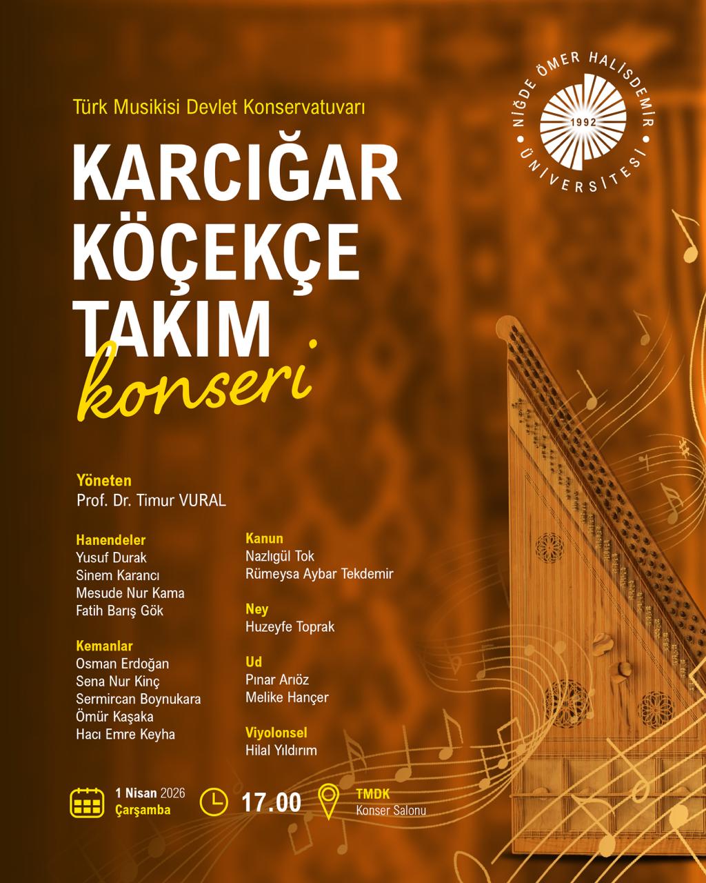 Karcığar Köçekçe Takım Konseri Etkinlik Ayrıntıları Etkinlik Adı: Karcığar Köçekçe Takım Konseri Etkinlik Tarihi: 01.04.2026 - 01.04.2026 / 17:00 Etkinlik Türü: Konser Etkinlik Yeri: Türk Musikisi Devlet Konservatuvarı Konser Salonu Türk Musikisi Devlet Konservatuvarı Konser Salonu Son Güncelleme Tarihi : 29.03.2026