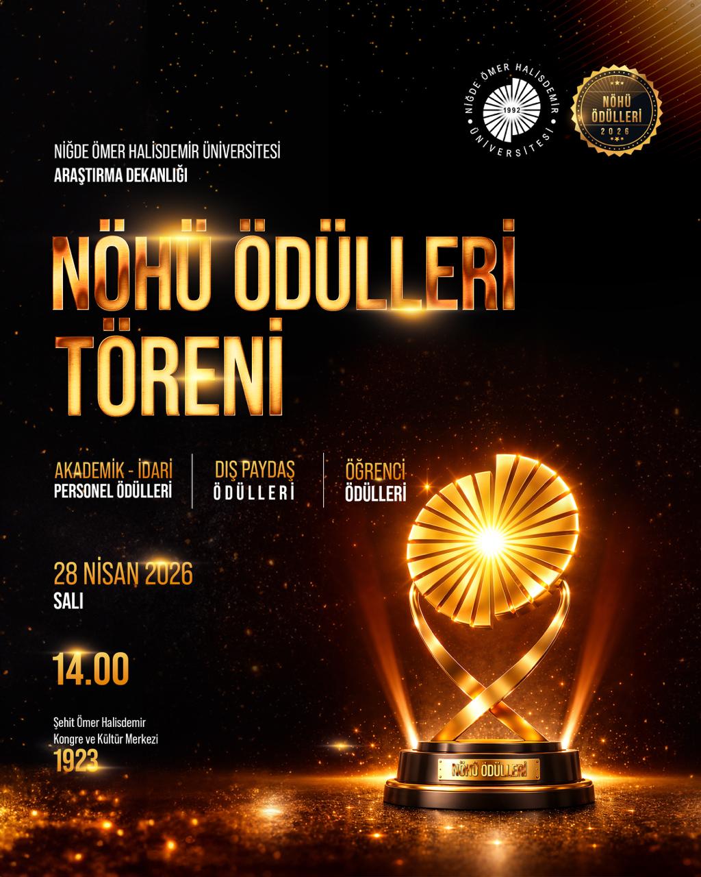 NÖHÜ Ödül Töreni Etkinlik Ayrıntıları Etkinlik Adı: NÖHÜ Ödül Töreni Etkinlik Tarihi: 28.04.2026 - 28.04.2026 / 14:00 Etkinlik Türü: Etkinlikler Etkinlik Yeri: Şehit Ömer Halisdemir Kongre ve Kültür Merkezi Salon 1923 Son Güncelleme Tarihi : 27.04.2026