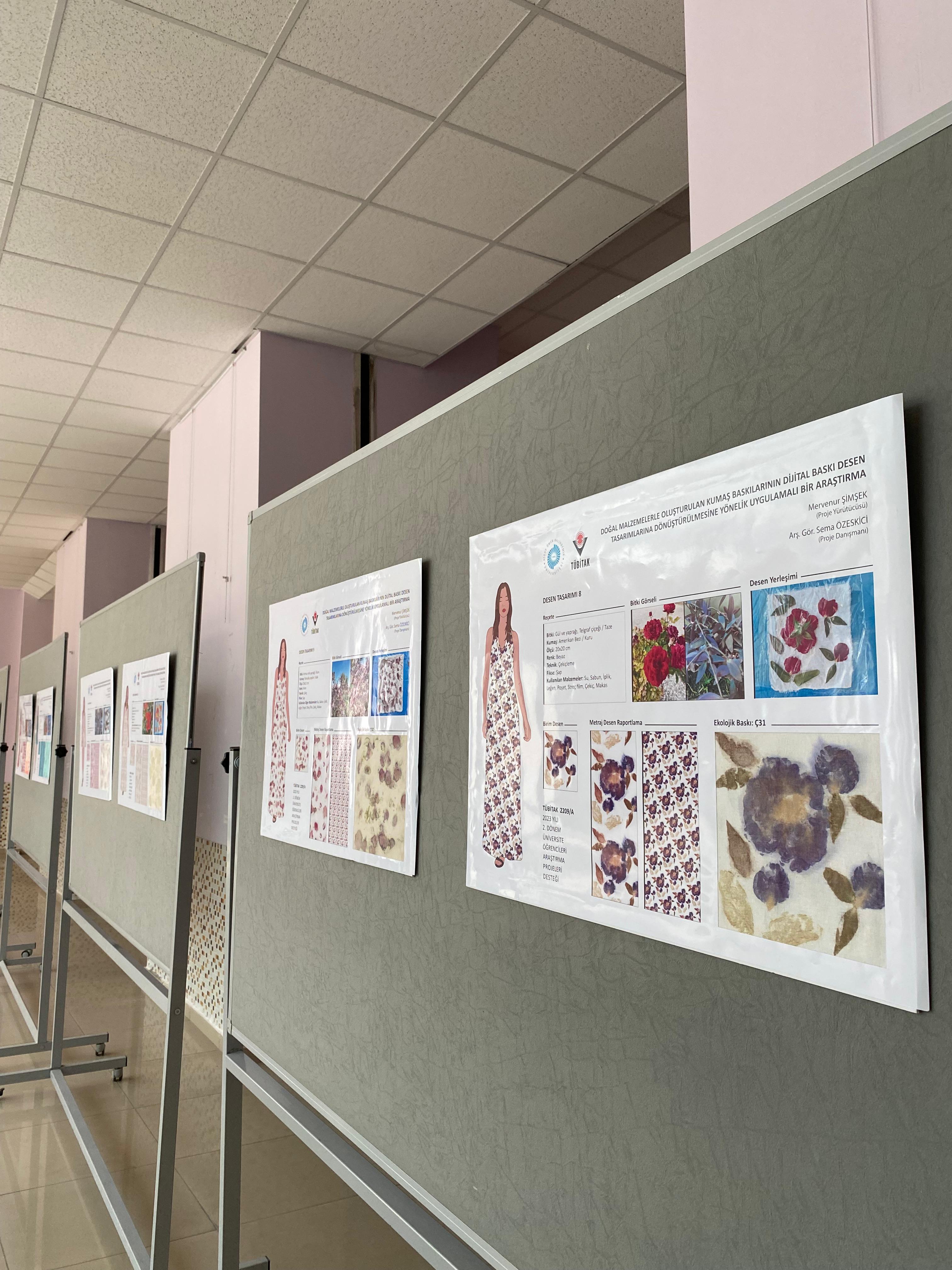 Arş. Gör. Sema ÖZEKSİCİ danışmanlığında, öğrencimiz Mervenur ŞİMŞEK’in yürüttüğü 2023/2. Dönem TÜBİTAK 2209-A Üniversite Öğrencileri Projesi tamamlandı. 21 Nisan 2025 Pazartesi günü saat 14.00'da GSF Fuaye alanında düzenlenen etkinlikte “Doğal Malzemelerle Oluşturulan Kumaş Baskılarının Dijital Baskı Desen Tasarımlarına Dönüştürülmesine Yönelik Uygulamalı Bir Araştırma” adlı projede üretilen ekolojik baskı çalışmaları 'Organikten Dijitale' adlı sergide sergilendi. Proje, Sürdürülebilir Kalkınma Hedeflerinden ‘Sorumlu Üretim ve Tüketim’ kapsamında ele alınarak sürdürülebilirliğe katkı sağladı. Proje kapsamında, özellikle ağaç budama sürelerinde toplanan çiçek, yaprak ve bitki gibi doğal malzemeler, buharda bekletme, çekiçleme ve kaynatma teknikleriyle birim desenlere dönüştürüldü. Bu desenler dijital ortamda metraj kumaş desenine dönüştürüldü ve moda illüstrasyonlarında elbise tasarımlarına giydirildi.