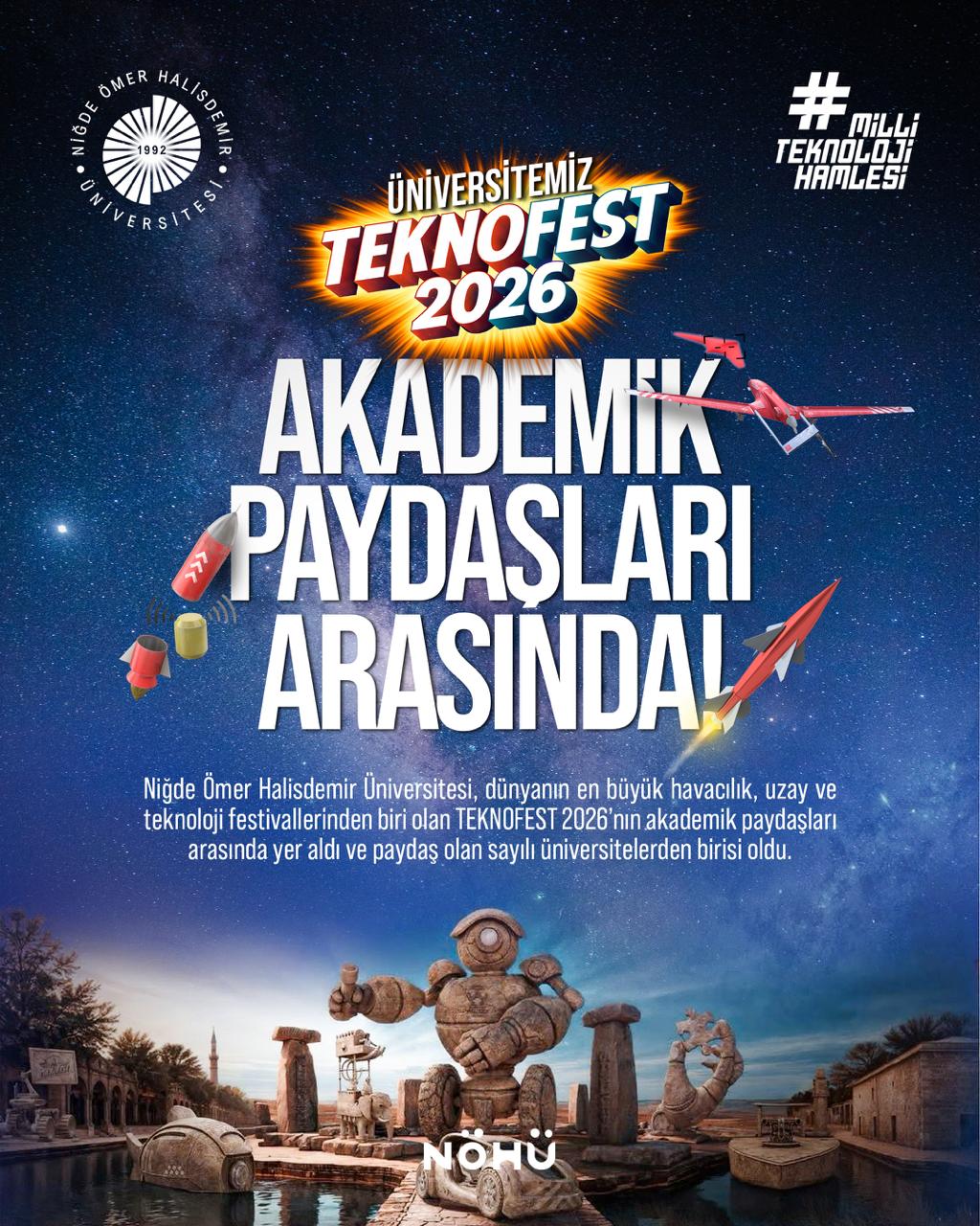 Niğde Ömer Halisdemir Üniversitesi, dünyanın en büyük havacılık, uzay ve teknoloji festivallerinden biri olan TEKNOFEST 2026’nın akademik paydaşları arasında yer aldı ve paydaş olan sayılı üniversitelerden birisi oldu.