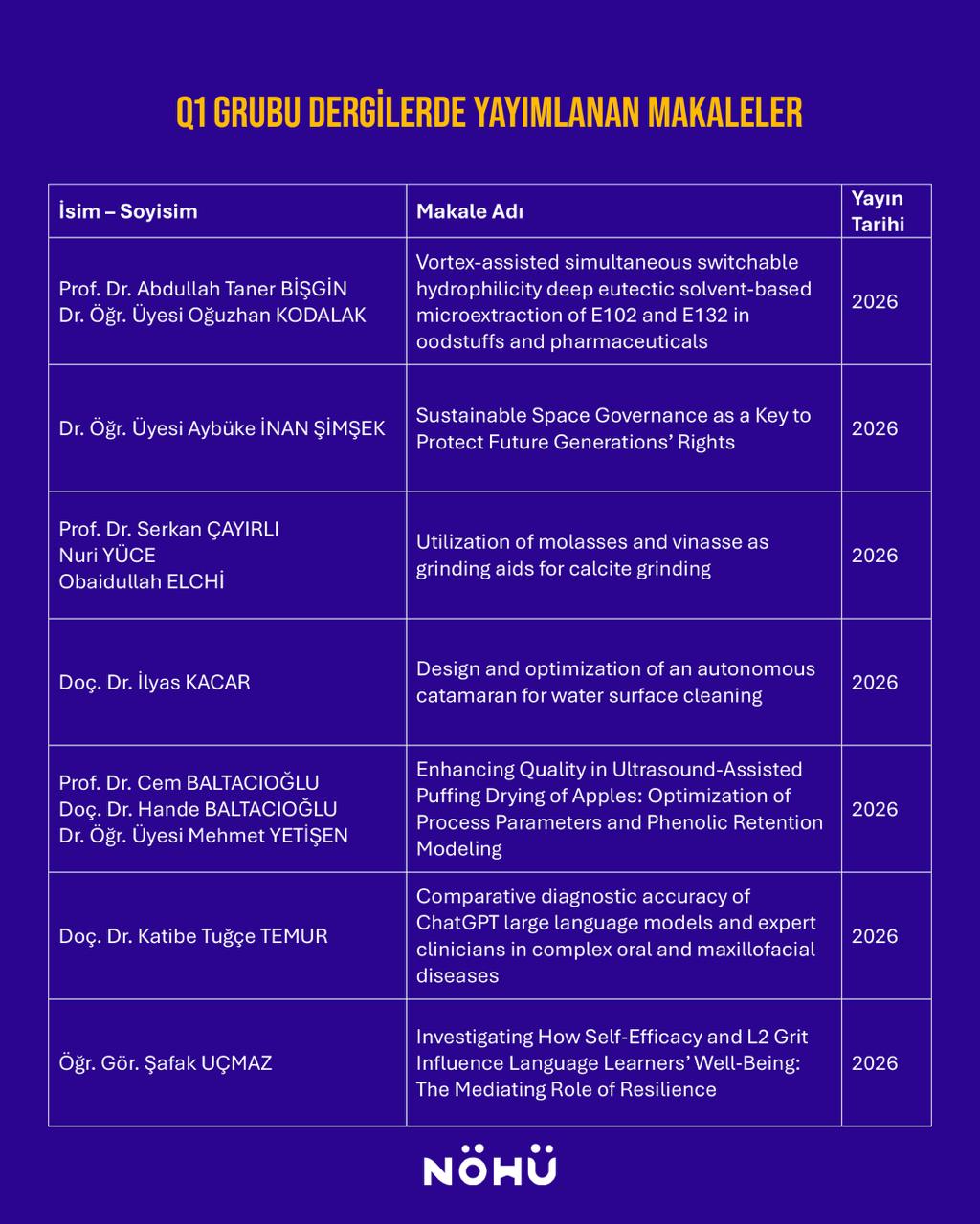 Üniversitemiz, 2026 yılının ilk ayında bilimsel yayın performansıyla önemli bir başarıya imza attı. Akademisyenlerimizin Ocak 2026 döneminde toplam 14 makalesi, Q1 kategorisindeki uluslararası dergilerde yayımlandı.