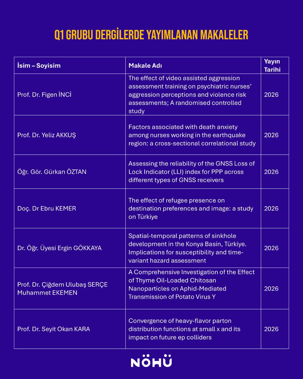 Q1 sınıfında yer alan dergiler, bilimsel etki düzeyi ve atıf performansı bakımından kendi alanlarının en seçkin yayın organları arasında gösterilmektedir. Bu dergilerde yayımlanan çalışmalar, hem araştırma kalitesinin hem de uluslararası akademik görünürlüğün önemli bir göstergesi olarak kabul edilmektedir. Üniversitemiz, uluslararası düzeyde yüksek etki değerine sahip dergilerde yayın üretimini artırmayı, akademik iş birliklerini güçlendirmeyi ve bilimsel araştırma altyapısını daha da geliştirmeyi sürdürmektedir.