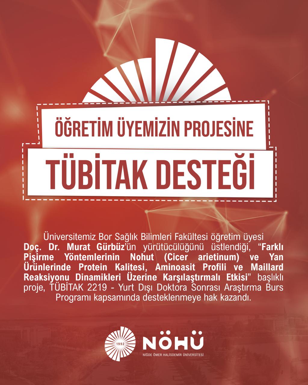Üniversitemiz Bor Sağlık Bilimleri Fakültesi öğretim üyesi Doç. Dr. Murat Gürbüz’ün yürütücülüğünü üstlendiği, “Farklı Pişirme Yöntemlerinin Nohut (Cicer arietinum) ve Yan Ürünlerinde Protein Kalitesi, Aminoasit Profili ve Maillard Reaksiyonu Dinamikleri Üzerine Karşılaştırmalı Etkisi” başlıklı proje, TÜBİTAK 2219 - Yurt Dışı Doktora Sonrası Araştırma Burs Programı kapsamında desteklenmeye hak kazandı.