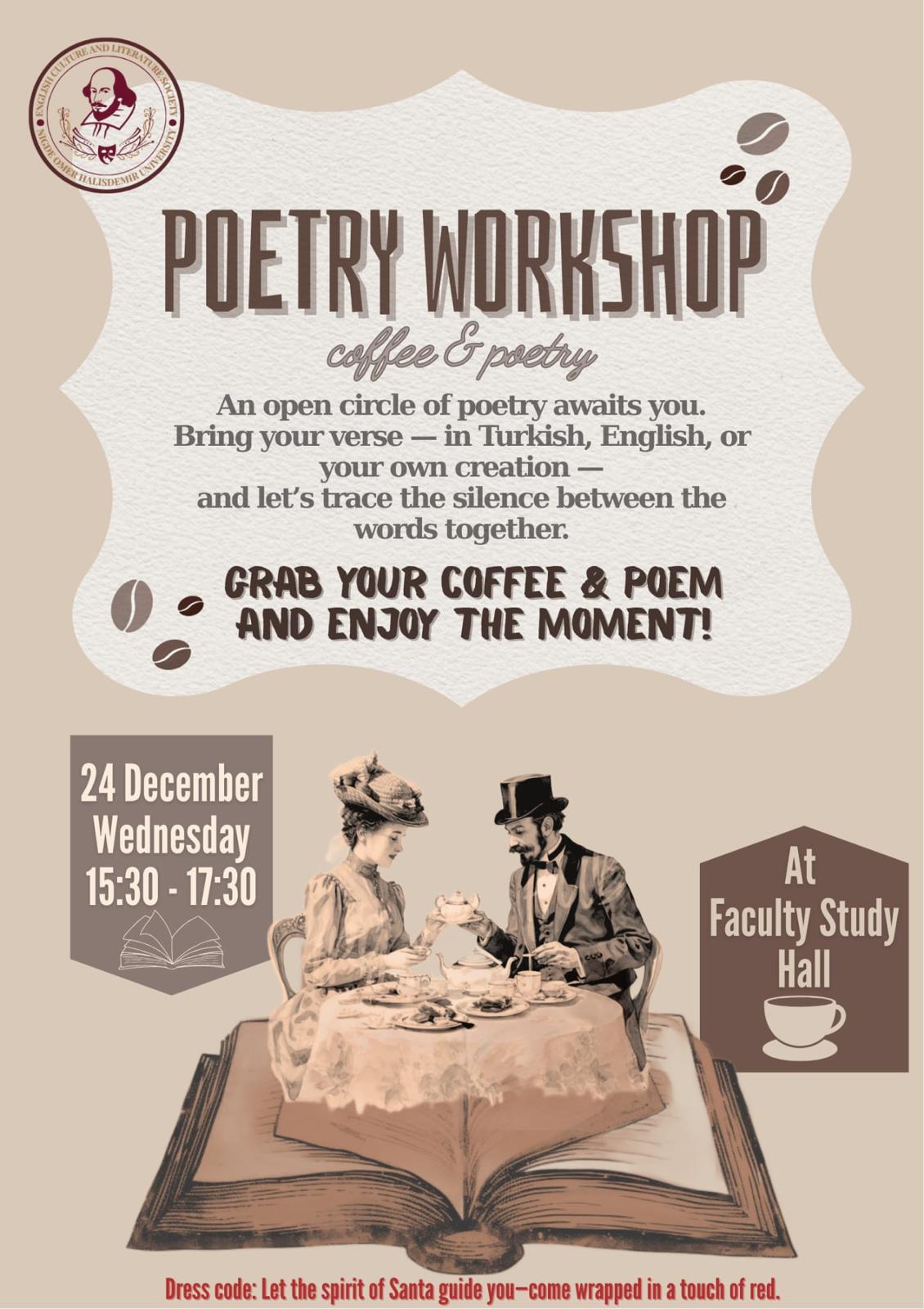 Poetry Workshop: Coffee & Poetry Etkinlik Ayrıntıları Etkinlik Adı: Poetry Workshop: Coffee & Poetry Etkinlik Tarihi: 24.12.2025 - 26.03.2027 Etkinlik Türü: Panel Son Güncelleme Tarihi : 16.03.2026
