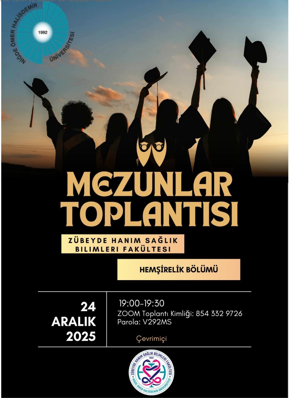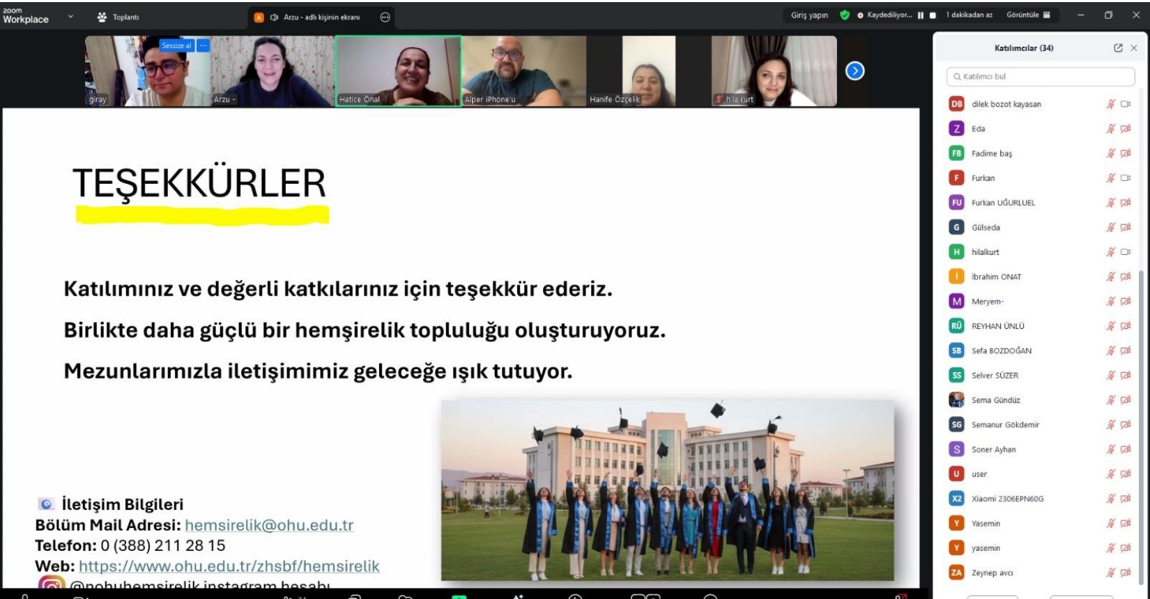 Üniversitemiz Zübeyde Hanım Sağlık Bilimleri Fakültesi Hemşirelik Bölümü mezun buluşması 24 Aralık Çarşamba günü saat: 19:00 da zoom üzerinden gerçekleşmiştir. Etkinlikte sunucu aracılığıyla bölüm tanıtımı ve tarihçesi aktarılmış, bölümümüz mezunlarından örnekler verilerek bir önceki dönem yapılan mezun değerlendirme sonuçları paylaşılmıştır. Akademisyen ve klinikte çalışan mezunlarımızın değerli katkılarıyla etkinlik gerçekleştirilmiş, katılımcılardan eğitim ve uygulama alanlarına yönelik görüş ve öneriler alınmıştır. Öğrencilik döneminde alınan eğitimlerin çok kısa sürede klinik ortamında karşılık bulduğunu ancak klinik uygulamalarında sorunların devam ettiğini akademik birimler ile iş birliği halinde olarak bu sorunların çözülebileceği ifade edilmiştir. Etkinlik sonun mezun izlemlerinin yapılabilmesi, görüş ve önerilerin alınabilmesi için mezun anketi zoom üzerinden katılımcılarla paylaşılmıştır.