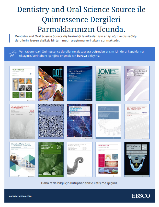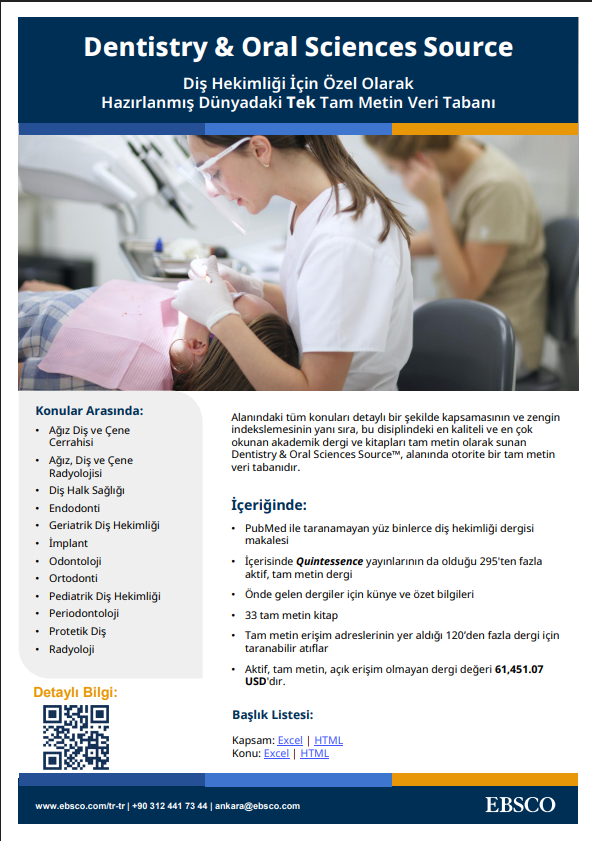 Dentistry and Oral Sciences Source (Ebsco) Veri tabanı 25 Mayıs 2026 tarihine kadar Deneme Erişimine açılmıştır. Duyurular 24.03.2026 Erişim için tıklayınız. Son Güncelleme Tarihi : 24.03.2026