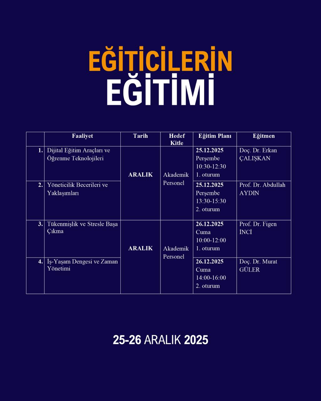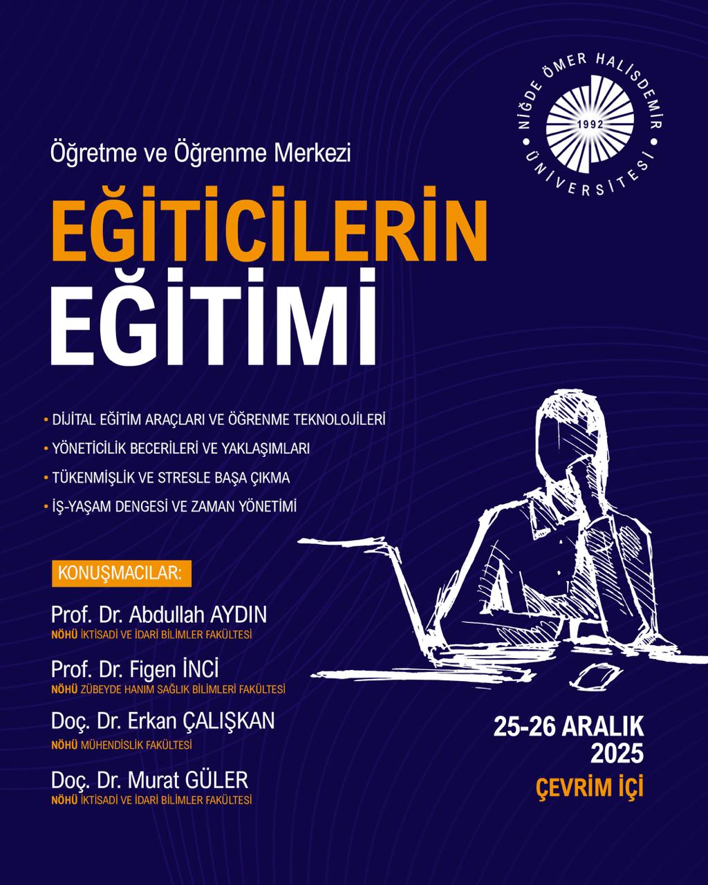 NÖMER tarafından, üniversitemiz akademik personelinin mesleki gelişimine katkı sağlamak amacıyla, 25-26 Aralık 2025 tarihlerinde çevrim içi olarak Eğitici Eğitimi Programı düzenlendi. İki gün süren programda, akademik personelin hem mesleki hem de kişisel gelişimini desteklemeye yönelik eğitimler verildi. Program kapsamında katılımcılara dijital eğitim araçları ve öğrenme teknolojileri, yöneticilik becerileri ve yaklaşımları, tükenmişlik ve stresle başa çıkma, iş-yaşam dengesi ve zaman yönetimi konularında bilgiler aktarıldı.