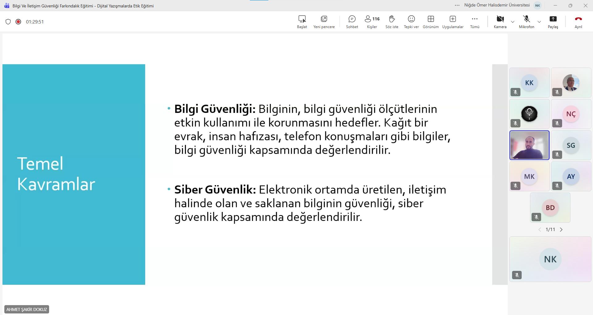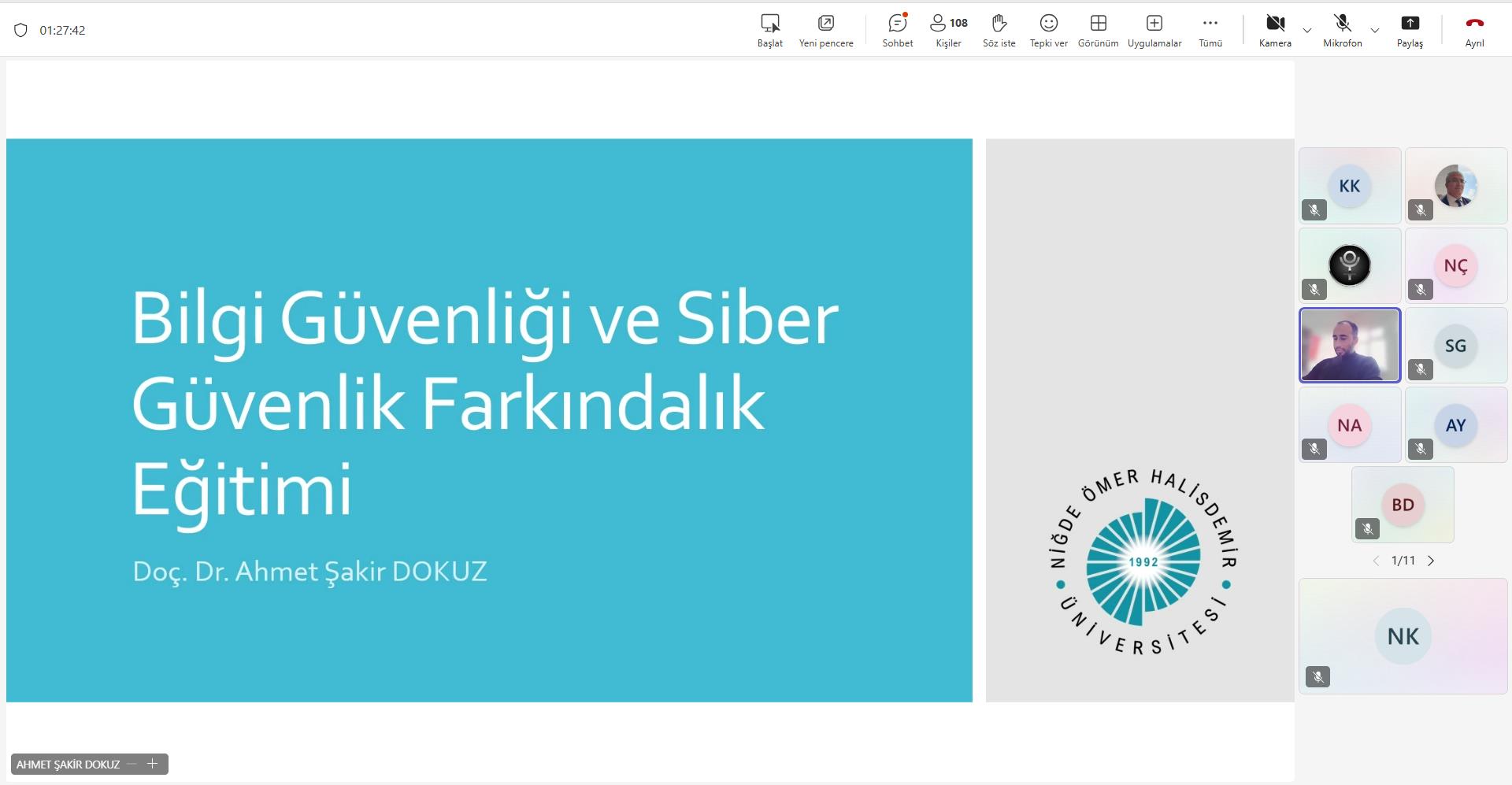 Üniversitemiz akademik ve idari personeline yönelik olarak, Niğde Ömer Halisdemir Üniversitesi Mühendislik Fakültemiz Öğretim Üyesi Doç. Dr. Ahmet Şakir DOKUZ tarafından çevrim içi “Bilgi ve İletişim Güvenliği Farkındalık” eğitimi gerçekleştirilmiştir. Eğitim kapsamında; bilgi güvenliği, karşılaşılan tehditler, saldırı türleri, mobil uygulama güvenliği ve kablosuz ağ güvenliği gibi konularda katılımcılara kapsamlı bilgiler sunulmuştur.