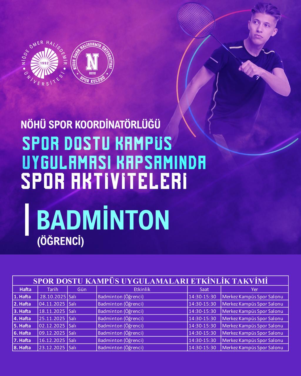 Spor Dostu Kampüs Badminton Etkinliği, projesi kapsamında düzenlenen, öğrencilerin ve personelin sportif ve sosyal etkileşimini artırmayı amaçlayan bir aktivitedir. Bu tür etkinlikler, hem fiziksel aktiviteyi teşvik eder hem de üniversite içinde sağlıklı yaşam kültürünün gelişmesine katkı sağlar.