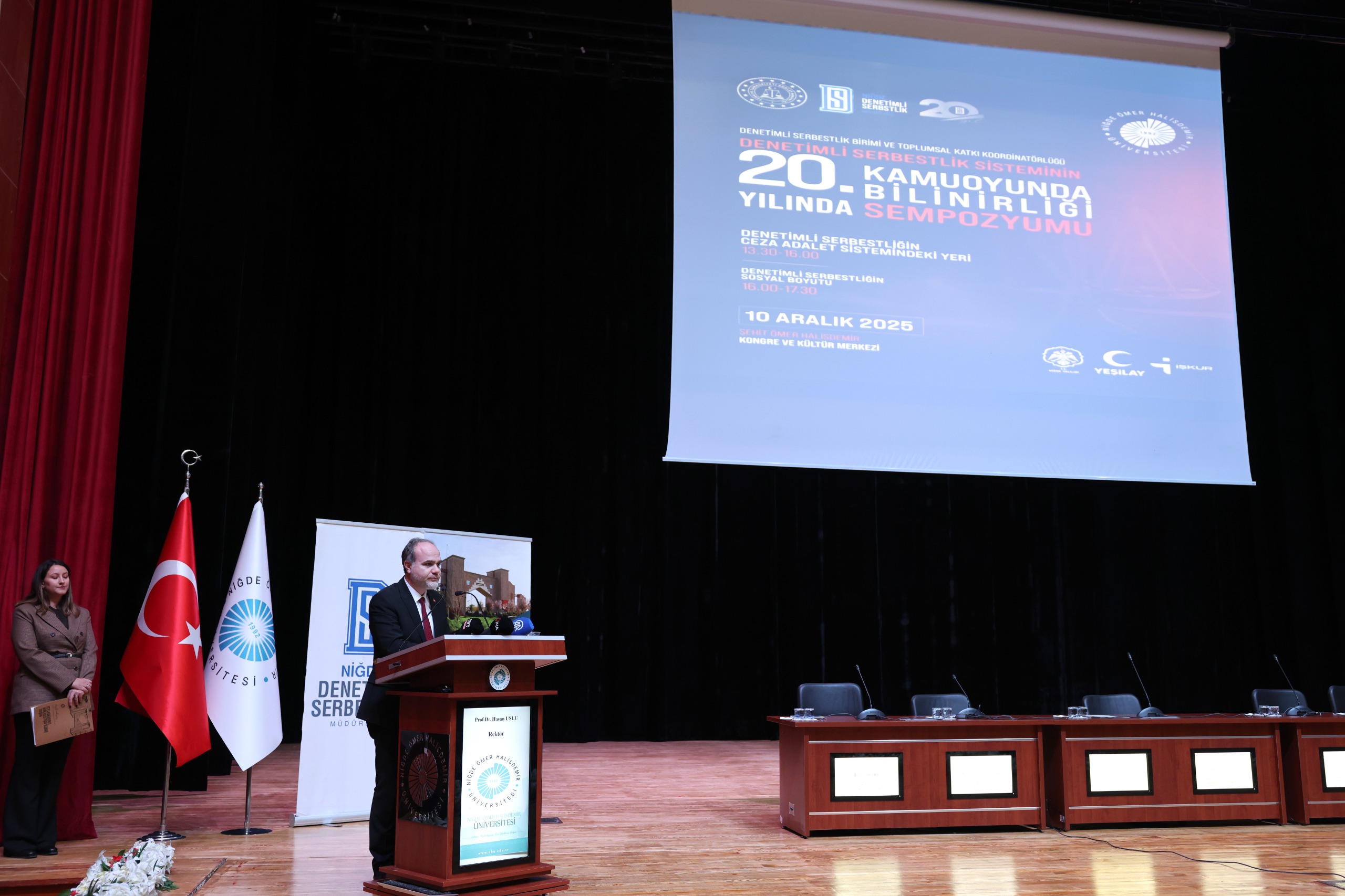 Üniversitemiz Rektörü Prof. Dr. Hasan Uslu sempozyumun açılışında yaptığı konuşmasında, denetimli serbestliğin yalnızca bir cezalandırma sistemi olmadığını, aynı zamanda bireyleri topluma yeniden kazandırma sürecinde kritik bir uygulama olduğunu vurguladı. Bu sürecin, ceza infaz kurumlarından tahliye olan bireylerin yeniden suç işlememesi ve topluma sağlıklı şekilde entegre olabilmesi için kurumlar arası koordinasyon, kamu–üniversite iş birlikleri ve toplumsal farkındalıkla yürütülmesi gerektiğini belirten Rektör Uslu, NÖHÜ’nün bilimsel bilgi, eğitim ve uzmanlık desteğiyle bu sürece katkı sunduğunu ifade etti. Rektör Uslu son olarak, “Sempozyumun düzenlenmesinde emeği geçen Adalet Bakanlığı, Niğde Valiliği, Denetimli Serbestlik Müdürlüğü ile tüm paydaşlara teşekkür eder, etkinliğin toplumsal farkındalık ve kapsayıcı politikaların geliştirilmesine katkı sağlamasını temenni ederim.” sözleriyle konuşmasına son verdi.